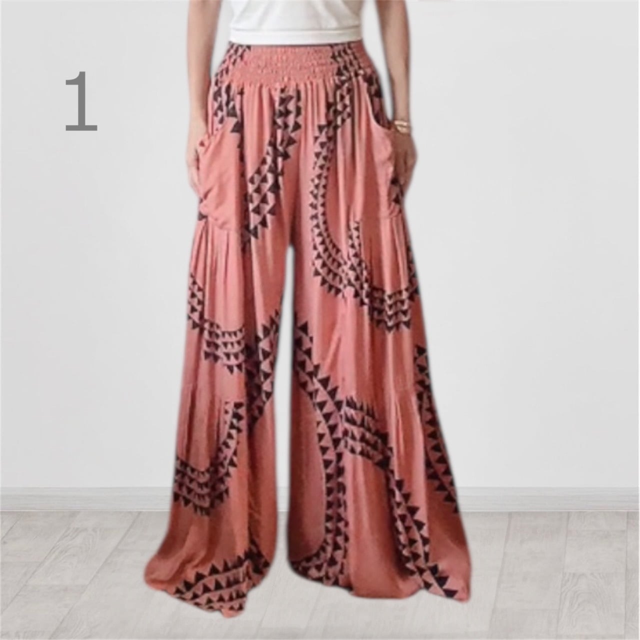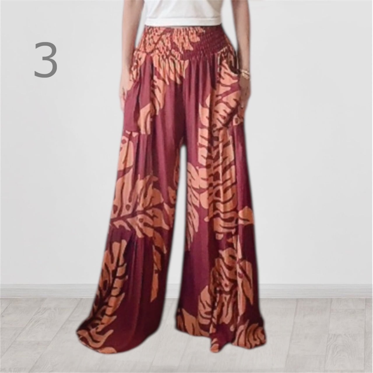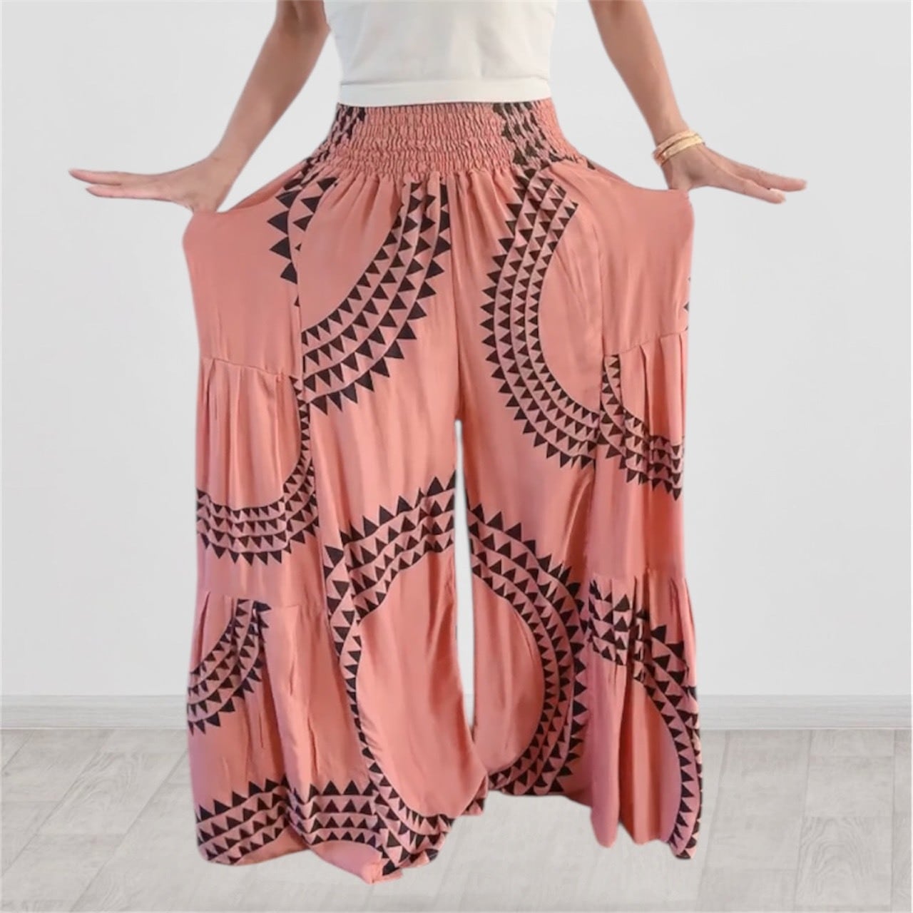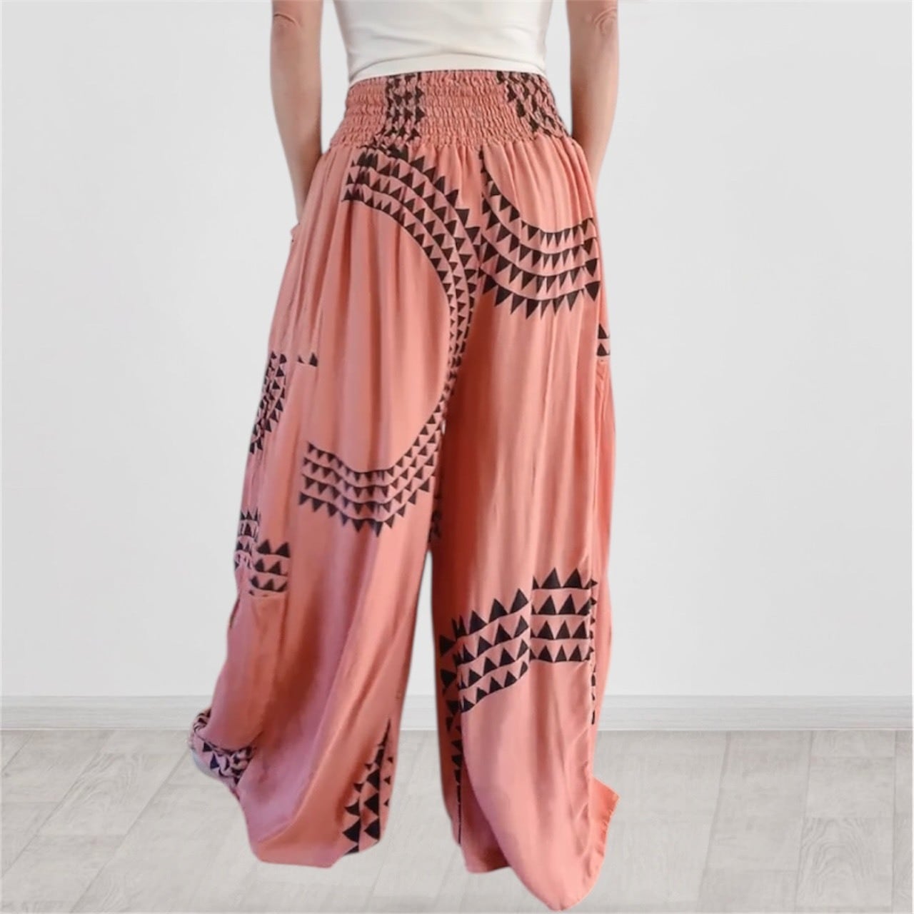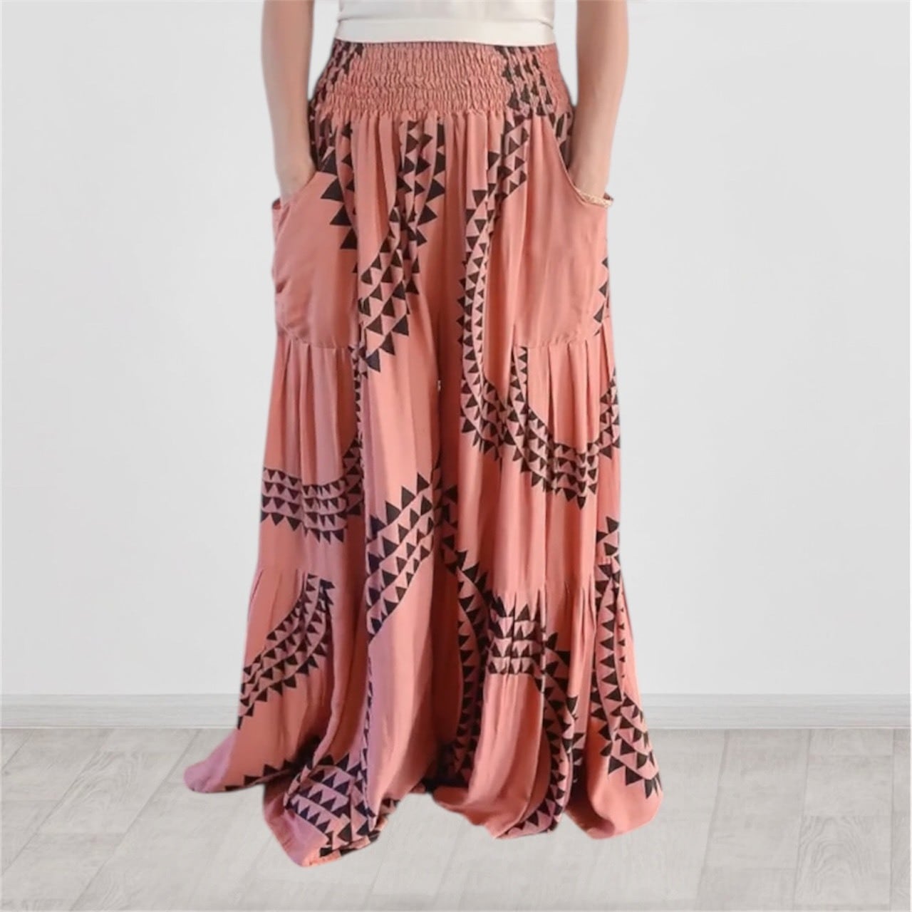 ウエストゴムで両サイドにポケット付き。