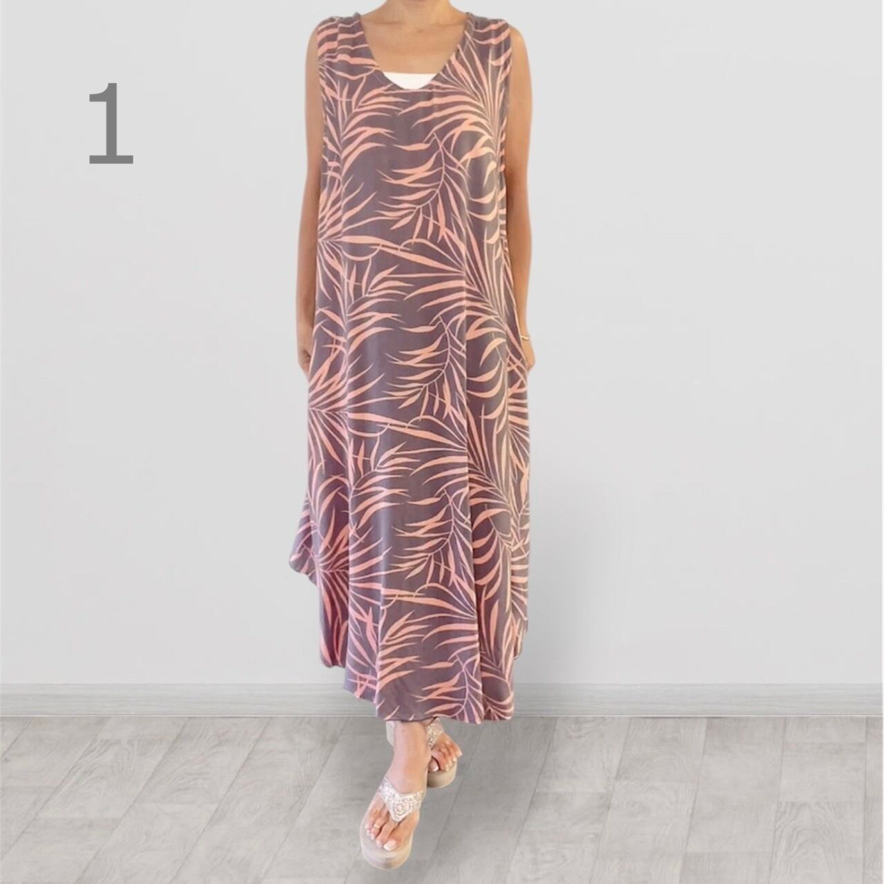 センターが長いノースリーブのワンピースです。